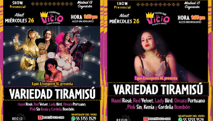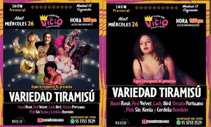 Equis Emergente AC presenta VARIEDAD TIRAMISÚ. SHOW PRESENCIAL DE TEATRO. Se trata de un espectáculo repleto de elegancia y gracia que resalta cualidades y distintas corporalidades. Será presentado el día miércoles 26 de abril a las 9:30 pm en el teatro bar “El Vicio”, ubicado en Madrid 13, Colonia Coyoacán, este evento se llevará acabo con la finalidad de revivir y celebrar la elegancia de los espectáculos nocturnos, llenando de risas, felicidad y celebración al espectador. Si tú también quieres ser parte de este magno evento te invitamos a que adquieras tus boletos en la página www.boletopolis.com o a través del número telefónico 55 3753 3529.