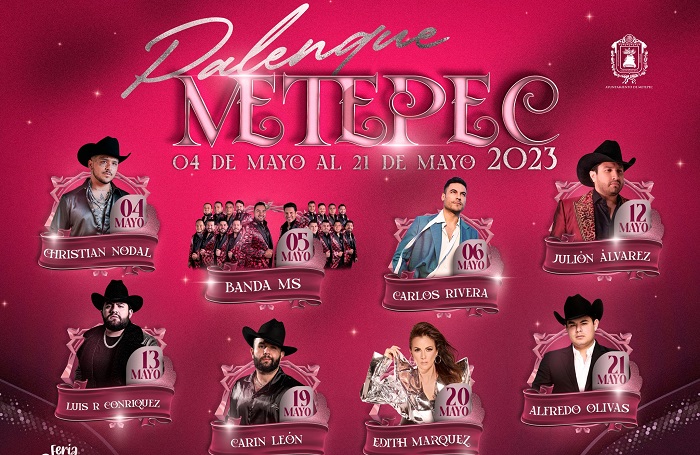 | Este año, el Palenque Feria San Isidro Metepec 2023 arrancará por todo lo alto, ya que una vez más presentará al mejor elenco para deleitar a los asistentes que año con año se dan cita en este recinto tan importante. Esta temporada del palenque se llevará a cabo del 04 al 21 de mayo y aquí les damos a conocer el cartel oficial: 04 mayo – Christian Nodal 05 mayo – Banda MS 06 mayo – Carlos Rivera 12 mayo – Julión Álvarez y su Norteño Banda 13 mayo – Luis R. Conriquez 19 mayo – Carin León 20 mayo – Edith Márquez 21 mayo – Alfredo Olivas Los boletos estarán a la venta a partir de este lunes 27 de marzo a través de www.ticketime.com.mx y en el Hotel Fiesta Inn Tollocan en un horario de 11:00AM a 6:00PM. Así que prepárate para cantar y bailar en estos grandes eventos que tiene preparados para ti el PALENQUE METEPEC 2023 |